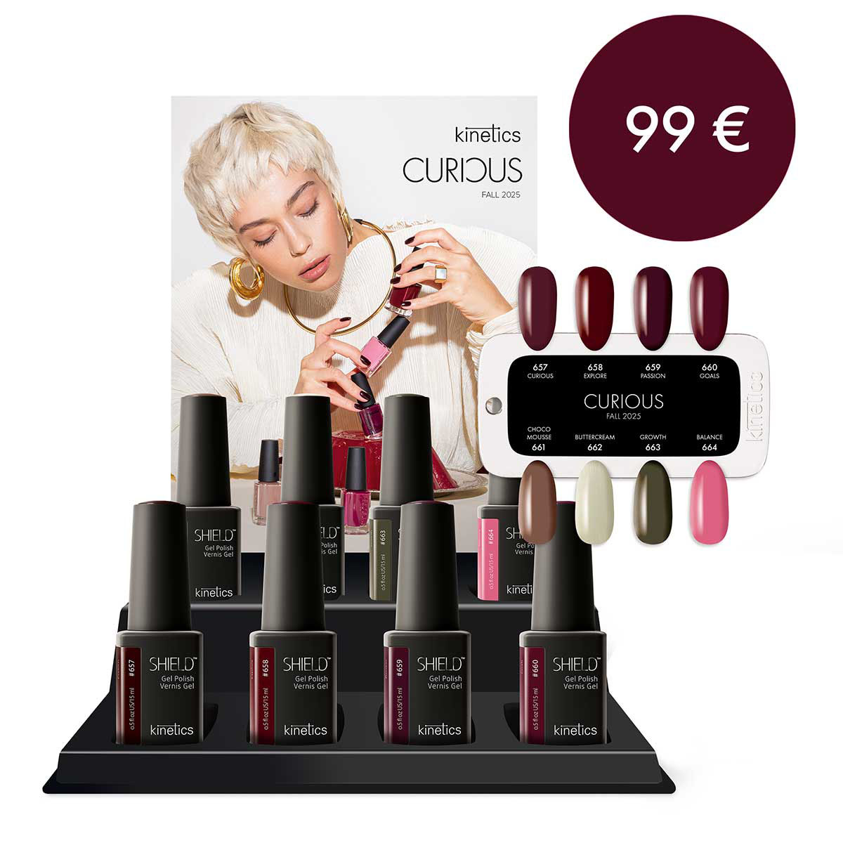 CURIOUSBe passionately curious!Curiosity enriches our lives, leading us to explore, learn, taste, experience the world more deeply. As Albert Einstein said, “The important thing is not to stop questioning. Curiosity has its own reason for existing.” Let your boundaries fall and dive in to enrich your being.Kit consists of display, all 8 collection colors, collection colorchart and lookbook.All colors are in HEMA free formula.